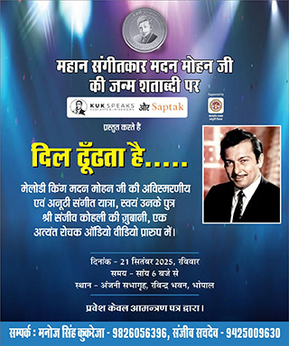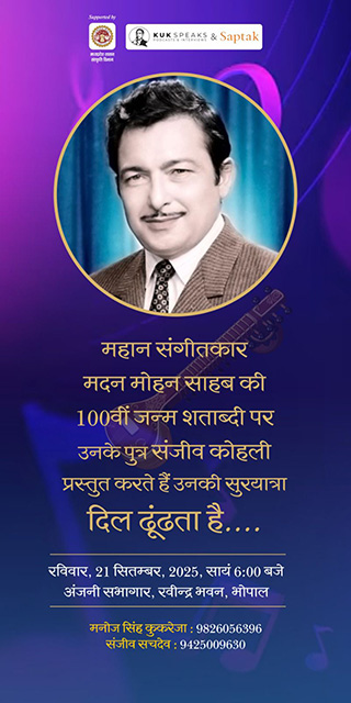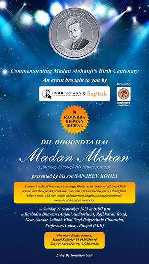 In continuation of the commemoration of Madan Mohanji’s Birth Centenary, his son Sanjeev Kohli will present DIL DHOONDTA HAI - A Journey through his Timeless Music in Bhopal on Sunday 21 September.