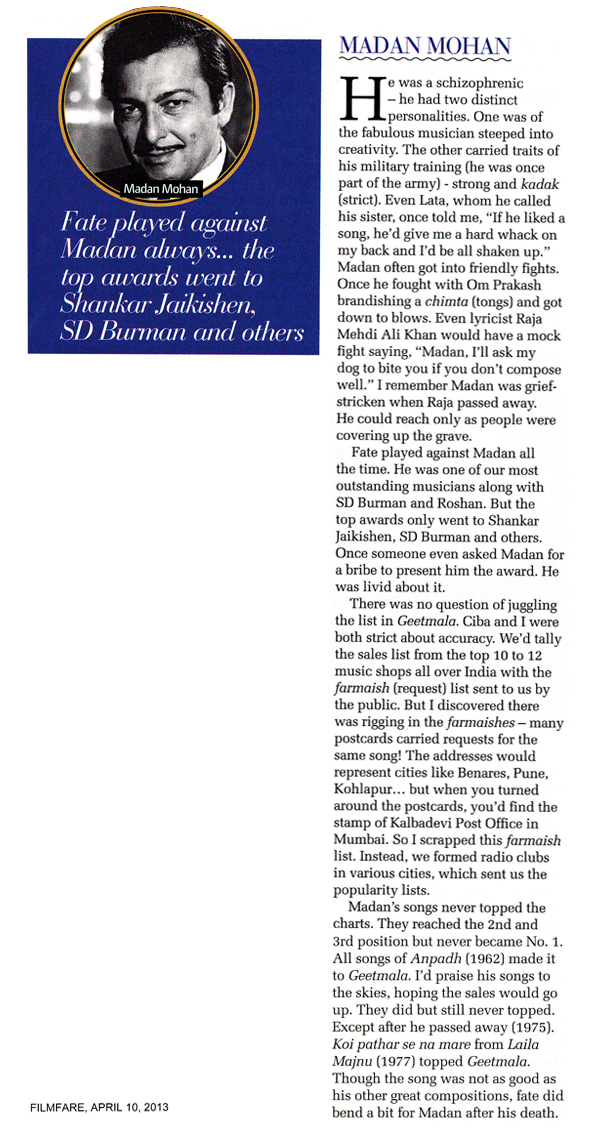 Ameen Sayani remembers Madan Mohanji in recent article in Filmfare