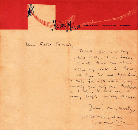 Mr. Felix Corea, a lover of old film music, recently shared with us two such letters that he had received from Madanji in the 60's.