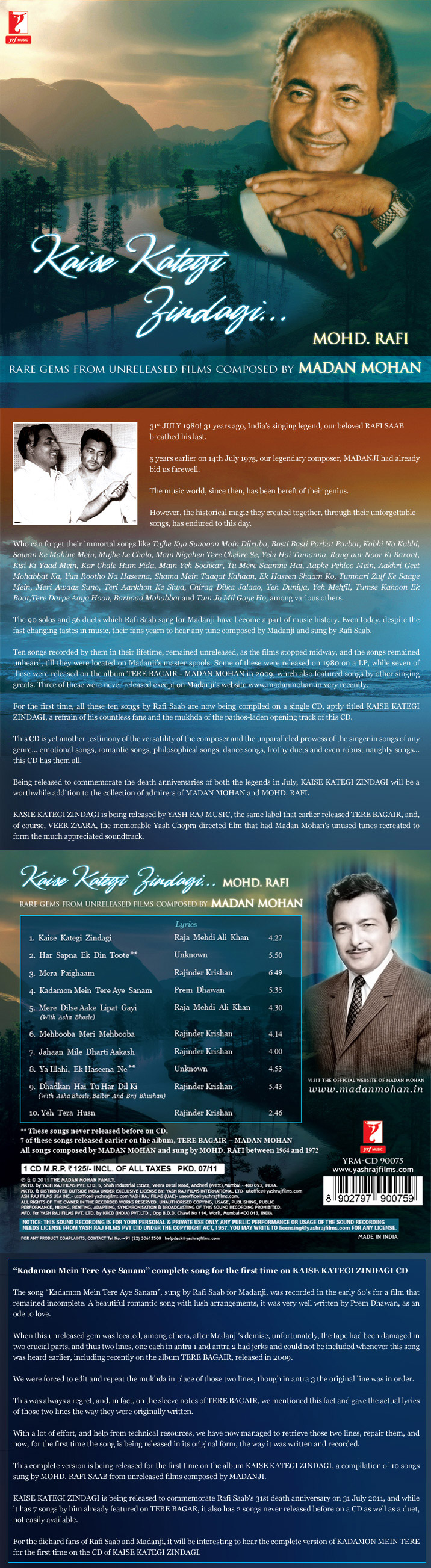 KAISE KATEGI ZINDAGI, an album of rare songs by RAFI SAAB, composed by MADANJI, being released to commemorate the legendary singer's 31st death anniversary 22 July 2011
