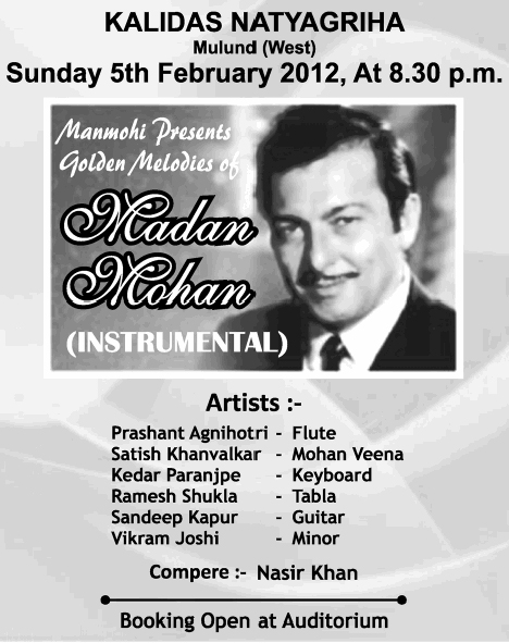 A concert of Instrumentals of Madanji's Melodies will be held on Sunday 5th February, 2012 at Mulund, Mumbai. Watch the Ad on the right for more details.